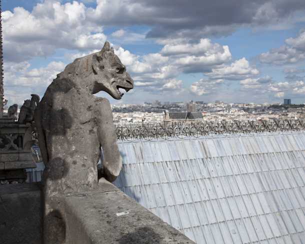 The grotesques, the stone statues which adorn the upper gallery between Notre-Dame's two towers, were designed by Eugène Viollet-le-Duc in the 19th century. They recreate the fantastic universe of the Middle Ages. Unlike the gargoyles which have a function of draining of rainwater, the grotesques serve only a decorative function.