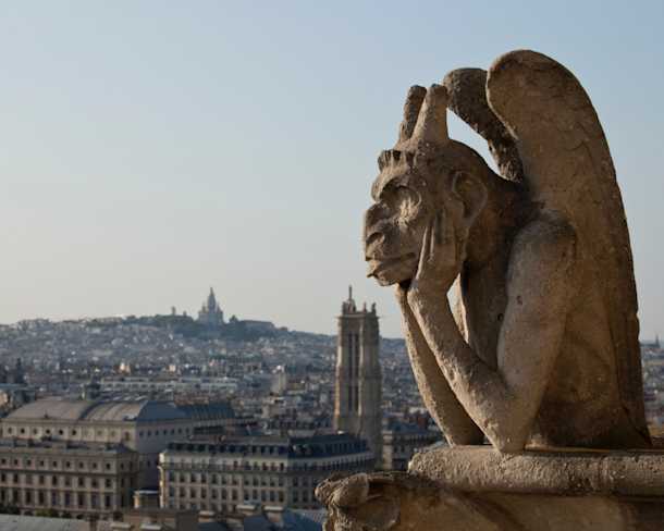 The grotesques, the stone statues which adorn the upper gallery between Notre-Dame's two towers, were designed by Eugène Viollet-le-Duc in the 19th century. They recreate the fantastic universe of the Middle Ages. Unlike the gargoyles which have a function of draining of rainwater, the grotesques serve only a decorative function.