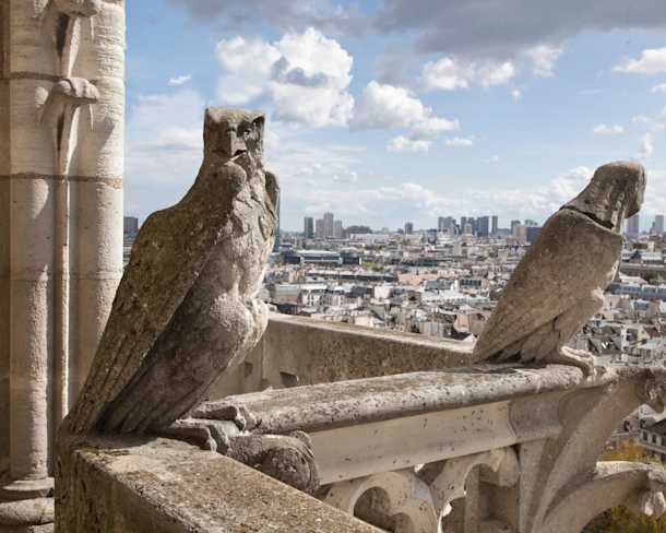The grotesques, the stone statues which adorn the upper gallery between Notre-Dame's two towers, were designed by Eugène Viollet-le-Duc in the 19th century. They recreate the fantastic universe of the Middle Ages. Unlike the gargoyles which have a function of draining of rainwater, the grotesques serve only a decorative function.