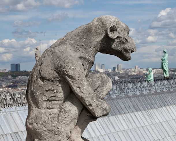 The grotesques, the stone statues which adorn the upper gallery between Notre-Dame's two towers, were designed by Eugène Viollet-le-Duc in the 19th century. They recreate the fantastic universe of the Middle Ages. Unlike the gargoyles which have a function of draining of rainwater, the grotesques serve only a decorative function.