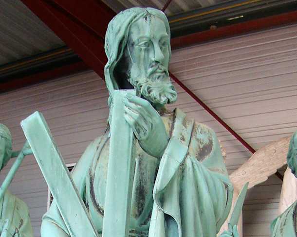 The representation of the Apostle Saint Andrew holds in both hands a cross in X, the instrument of his martyrdom. Located on the north-east corner of the spire base, this copper statue was designed by Eugene Viollet-le-Duc, sculpted by Adolphe Victor Geoffroy-Dechaume and produced by the Alteliers Monduit in 1861. Height: about 3 ft Weight: about 330 lb
