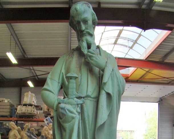 The representation of the Apostle Saint Paul holds in his right hand a large sword, the instrument of his martyrdom. Located on the south-east corner of the spire base, this copper statue was designed by Eugene Viollet-le-Duc, sculpted by Adolphe Victor Geoffroy-Dechaume and produced by the Alteliers Monduit in 1861. Height: about 3 ft Weight: about 330 lb